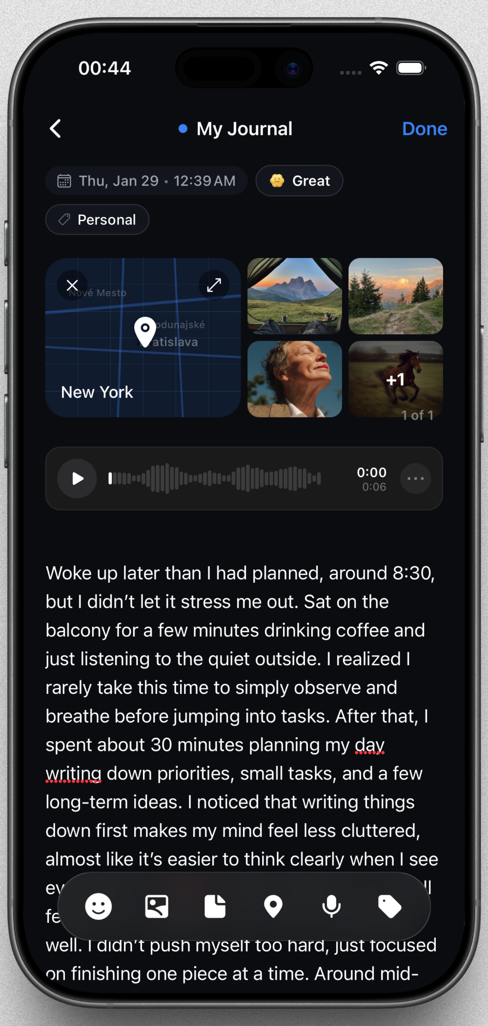 Yes. You can write text, upload images, attach files, record voice notes, tag locations, and read your past entries easily. Journaling shouldn’t be limited to just typing Jourlo adapts to how you feel today.